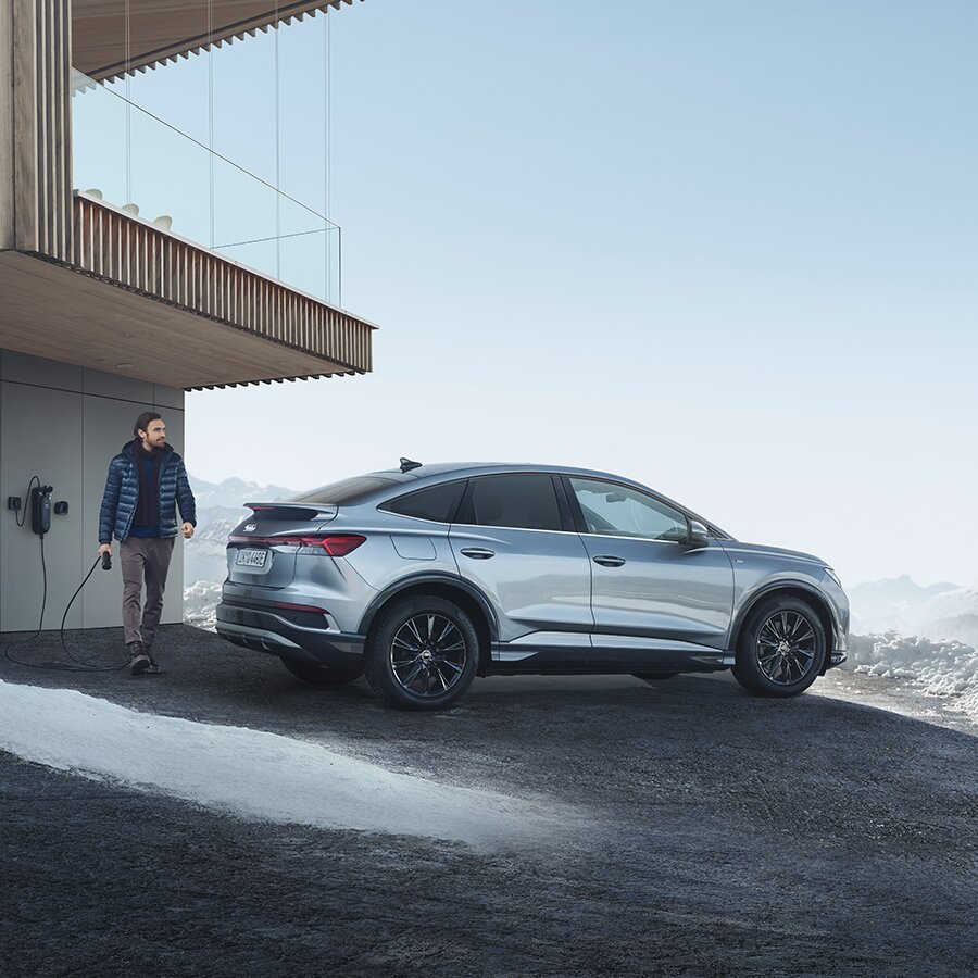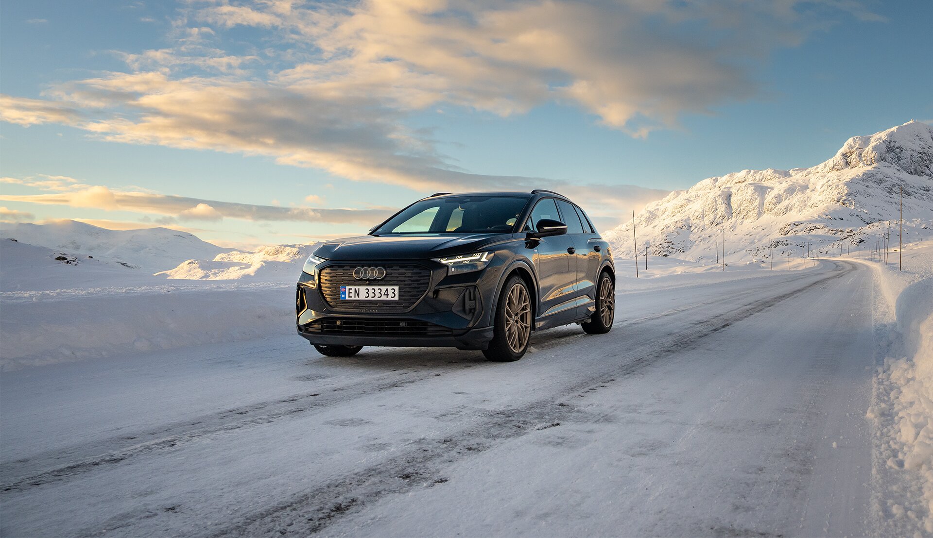 Q4 e-tron er en praktisk SUV med imponerende plass og premiumfølelse. Den har et moderne, skarpt design med en markant front, aerodynamiske linjer. quattro firehjulstrekk er standard, og med forvarming av batteriet lades bilen raskt selv under kalde forhold.